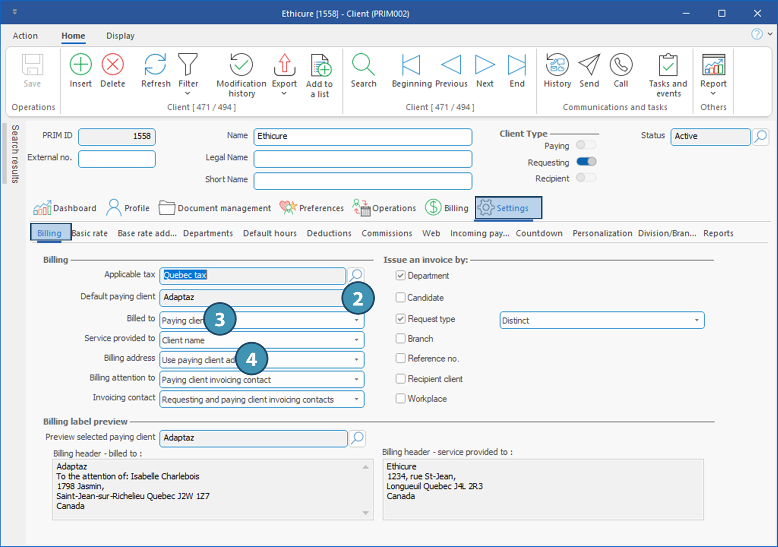 1.In a client file, click on Settings tab and on Billing sub-tab. 2.Click on 3.Specify if the invoice must be created with the name of the paying client or the requesting client. 4.In the field Billing address, select the address that should be displayed on the billing label (paying or requesting client).