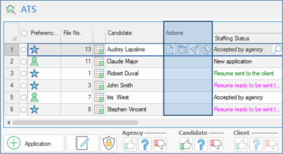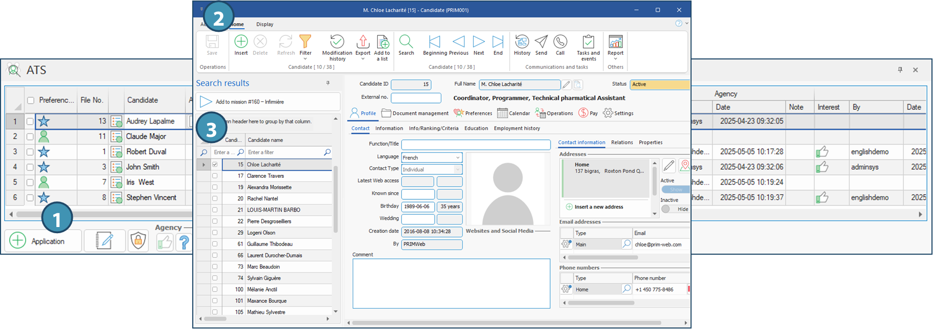 The ATS is the tool used to track applications for a job offer. In windows Job offer or Job offers management, click on ATS in Display ribbon to open it.
