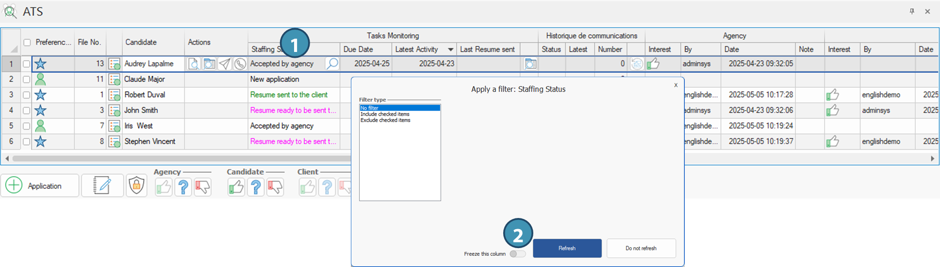 In order to make the ATS table easier to consult, you can freeze columns in order to lock horizontal scrolling. To do so, right-click on the column header, and activate the switch Freeze this column in the filter selection window, pushing it to the right.